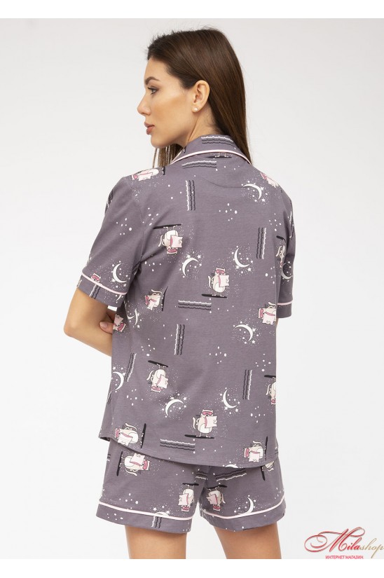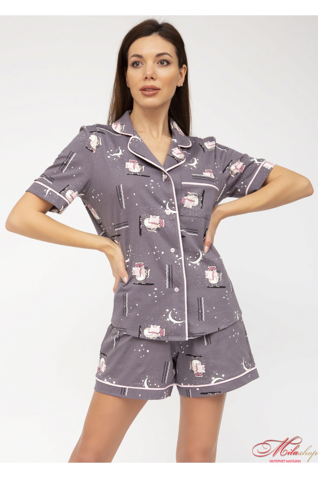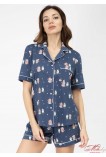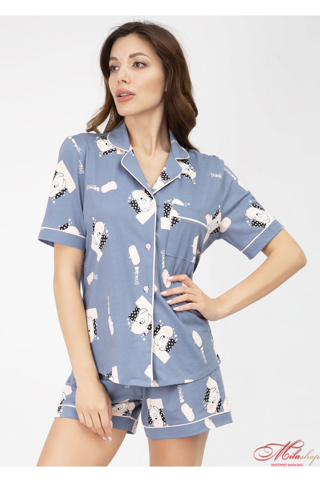 Домашняя женская пижама с мультяшными принтами. Комплект состоит из шорт и рубашки. Необычным элементом этой пижамы является «английский» воротник, застегивающийся на пуговицы. Он интересно разнообразит стиль пижамы. Края бортиков изделия и нижняя часть рукава декорированы кантом. Шортики короткие, пояс эластичный и удобно сидит на талии.