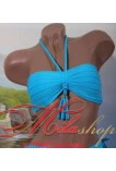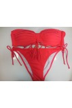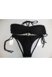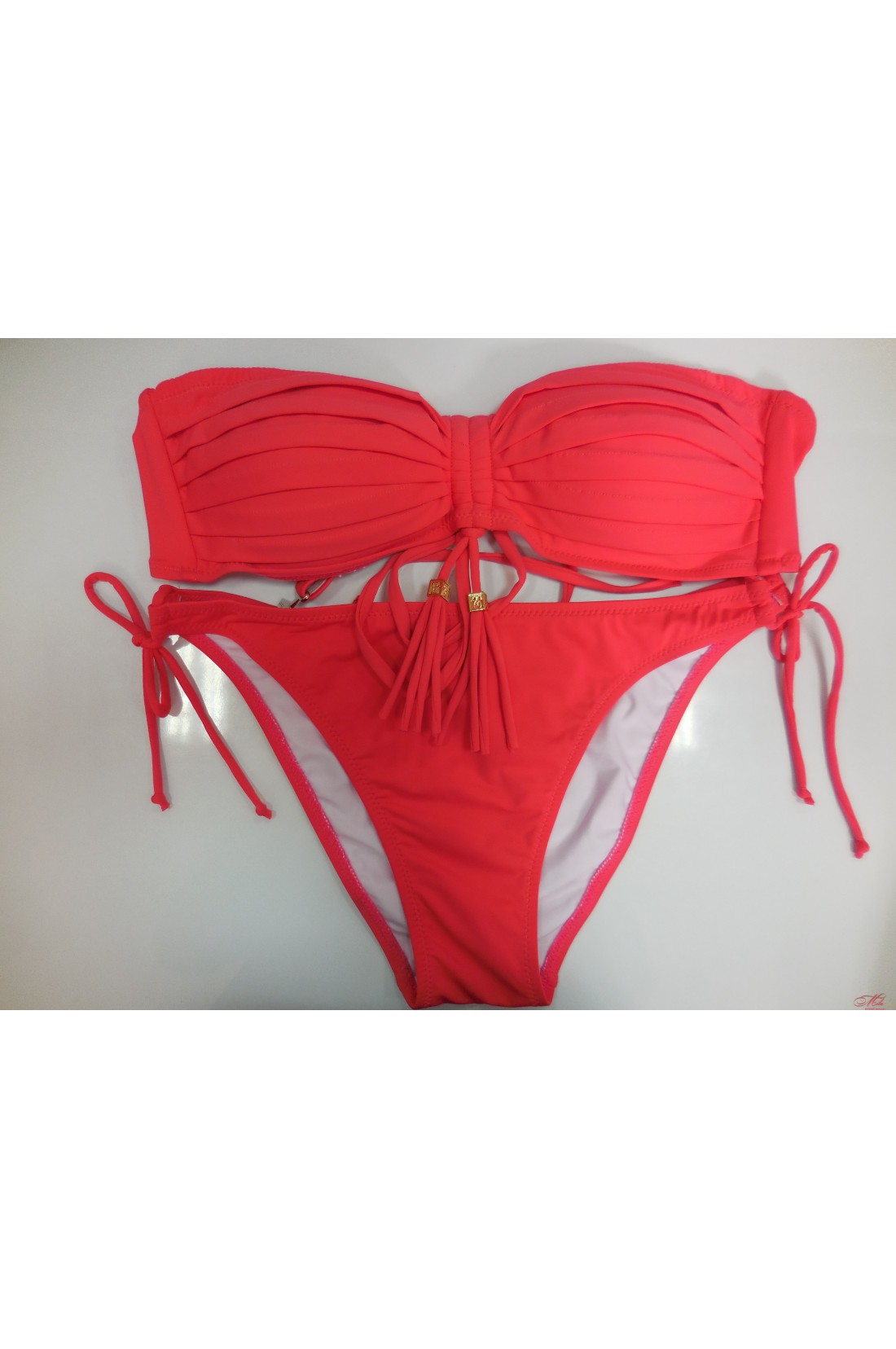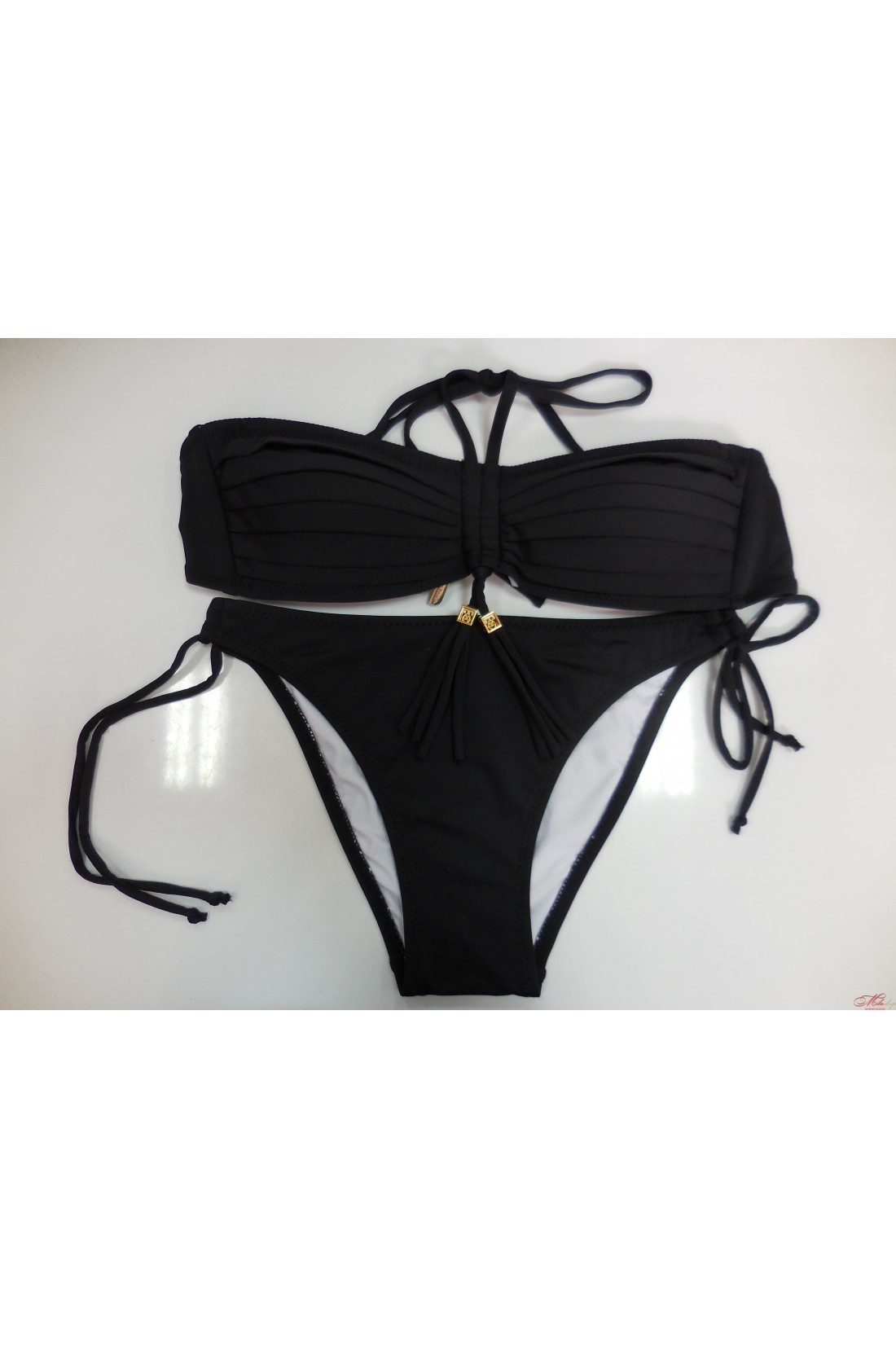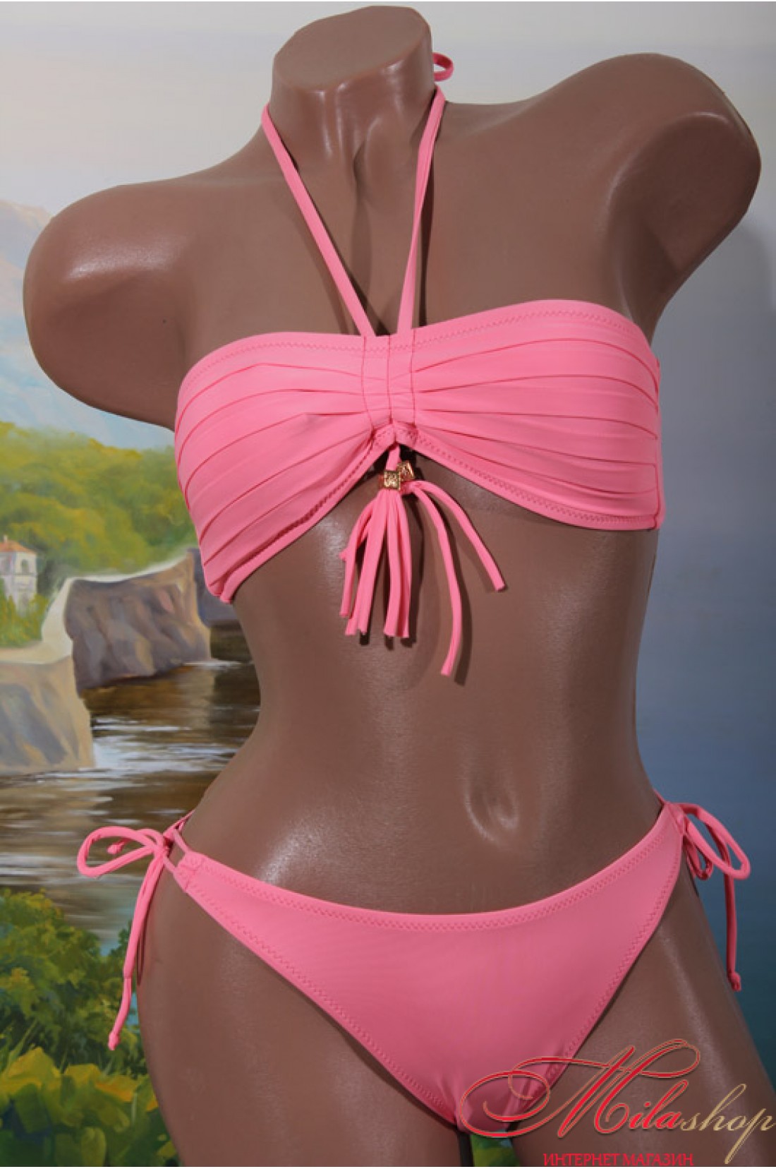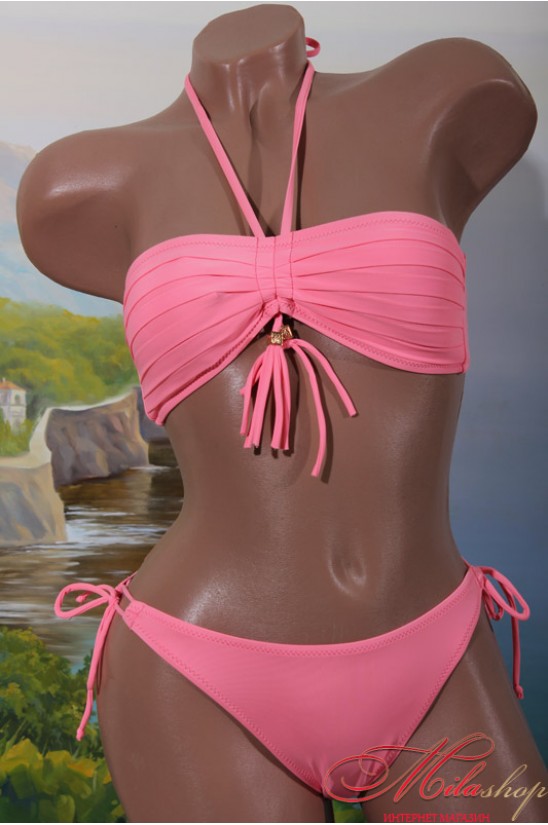 Раздельный купальник из высококачественного купального полотна, быстро сохнет. Бюстгальтер бандо с завязками через шею. Чашки бюстгальтера со съемным пуш-апом. Между чашками декор. Трусики слип с низкой линией талии, с кулисками по бокам. Размер европейский.