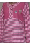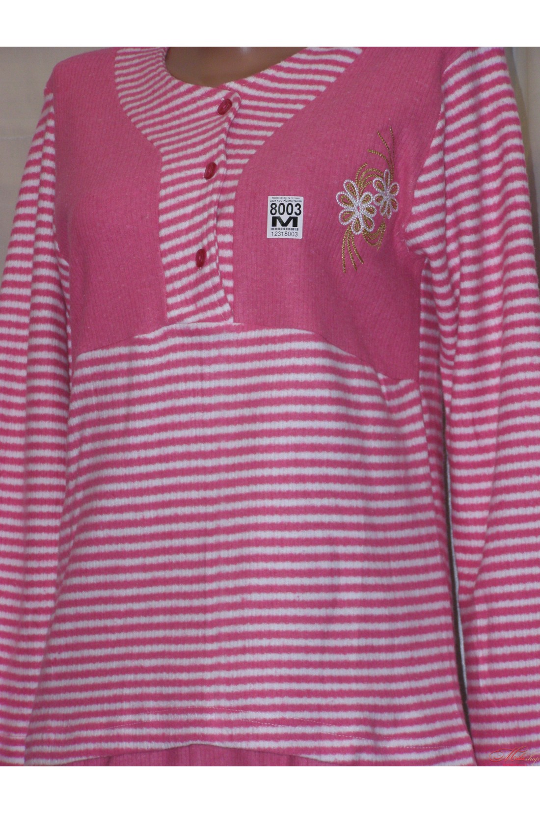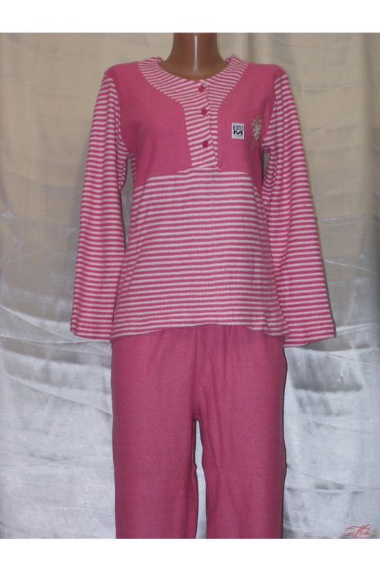 Теплая пижама из хлопка. Состоит из футболочки с длинным рукавом, которая украшена полосатым орнаментом и цветочной вышивкой и штанов, выполненных в одном тоне. Очень комфортная в носке, не сковывает движений во время сна.