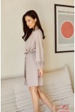 Легкий халат із глянцевим блиском, довгі рукави з мереживними манжетами внизу, крій на запах дозволяє регулювати посадку по фігурі, зав'язується на талії поясом, легке полотно добре пропускає повітря, створює ефект прохолоди на тілі.