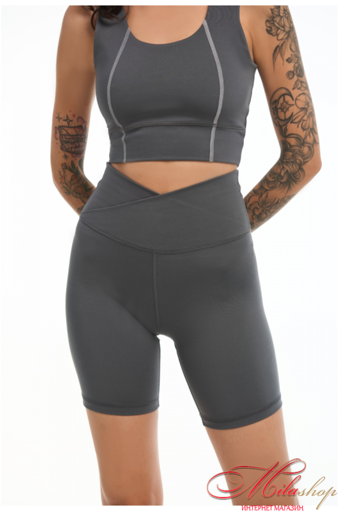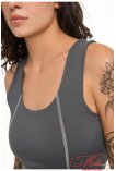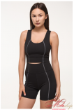 Топ зі спортивної мікрофібри з круглою середньою посадкою комірця. Декорований контрастними швами. З щільного матеріалу. Має подвійну конструкцію тканини, щоб мати комфортні та впевнені рухи. Висока посадка вирізу комірця. Пласкі шви. Внутрішні шви всі приховані та гладкі.