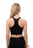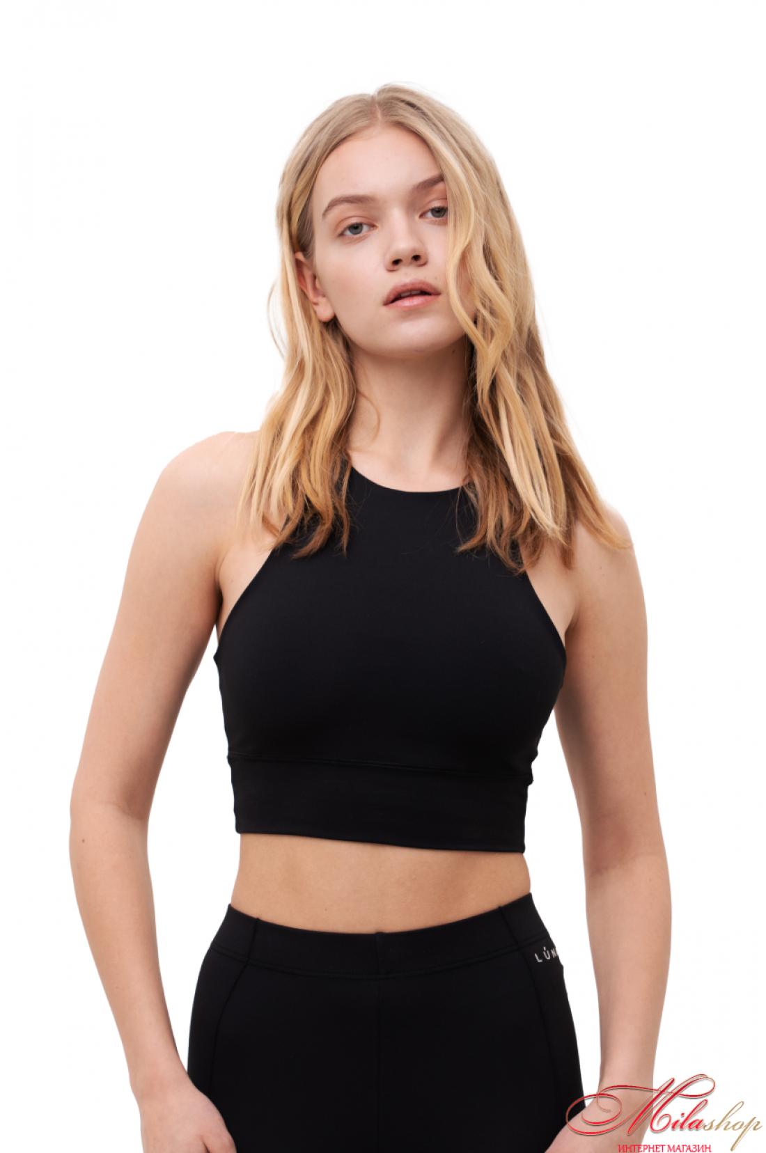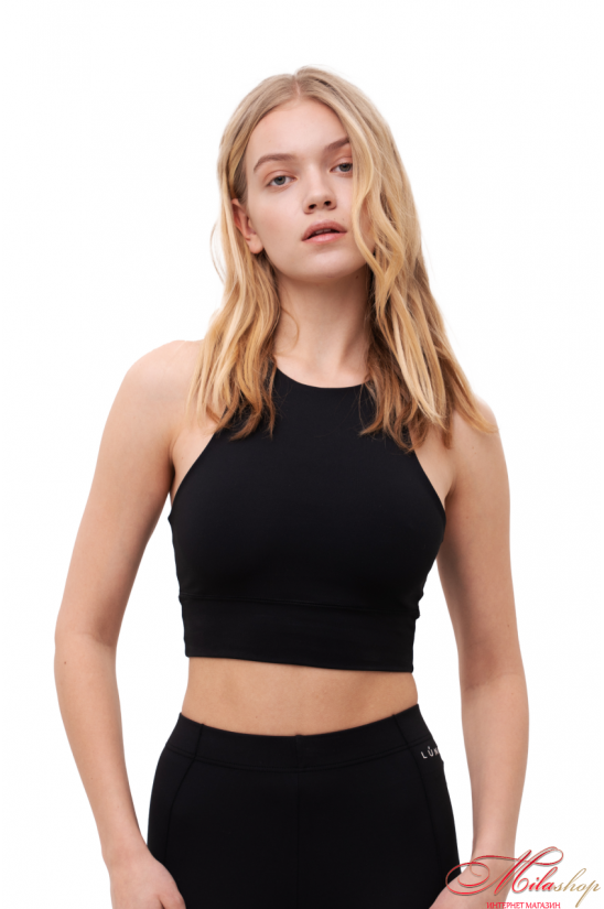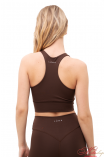 Топ спортивний довжиною трішки вище лінії талії. Має округлу анотомічну горловину по переду трішки нижще ярентої впадини, та фігурну Y-подібну спинку. По низу - манжет. Топ з підкладкою з основної тканини, тобто подвійний, за рахунок чого він щільніший. По центру спинки під горловиною є брендування. Тканина - біфлекс, гарно тягнеться, має гладеньку фактуру, кольорі капучино має більшу щільність, та менше тягнеться, це враховано в лекалах.