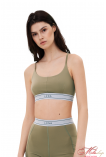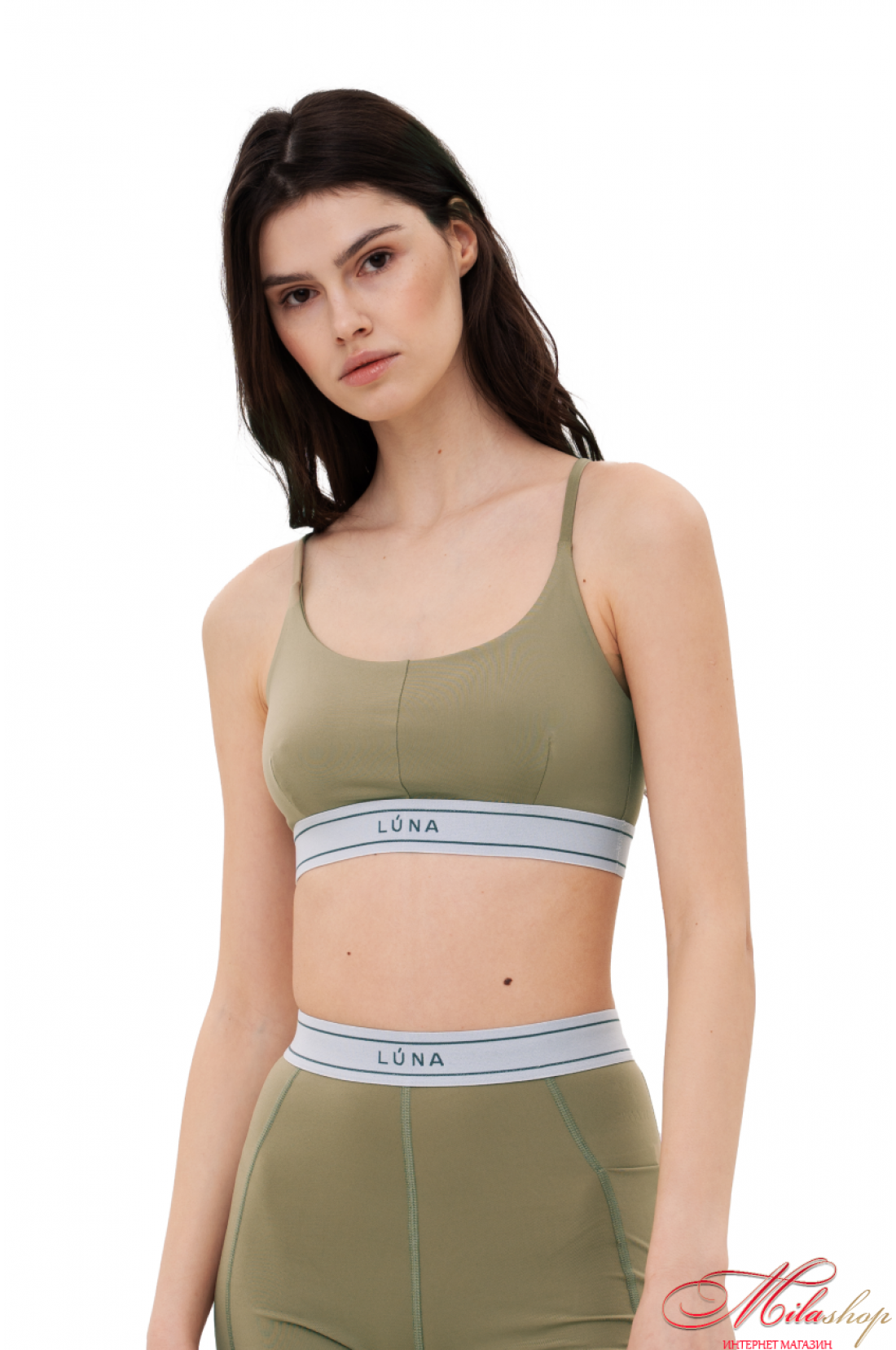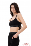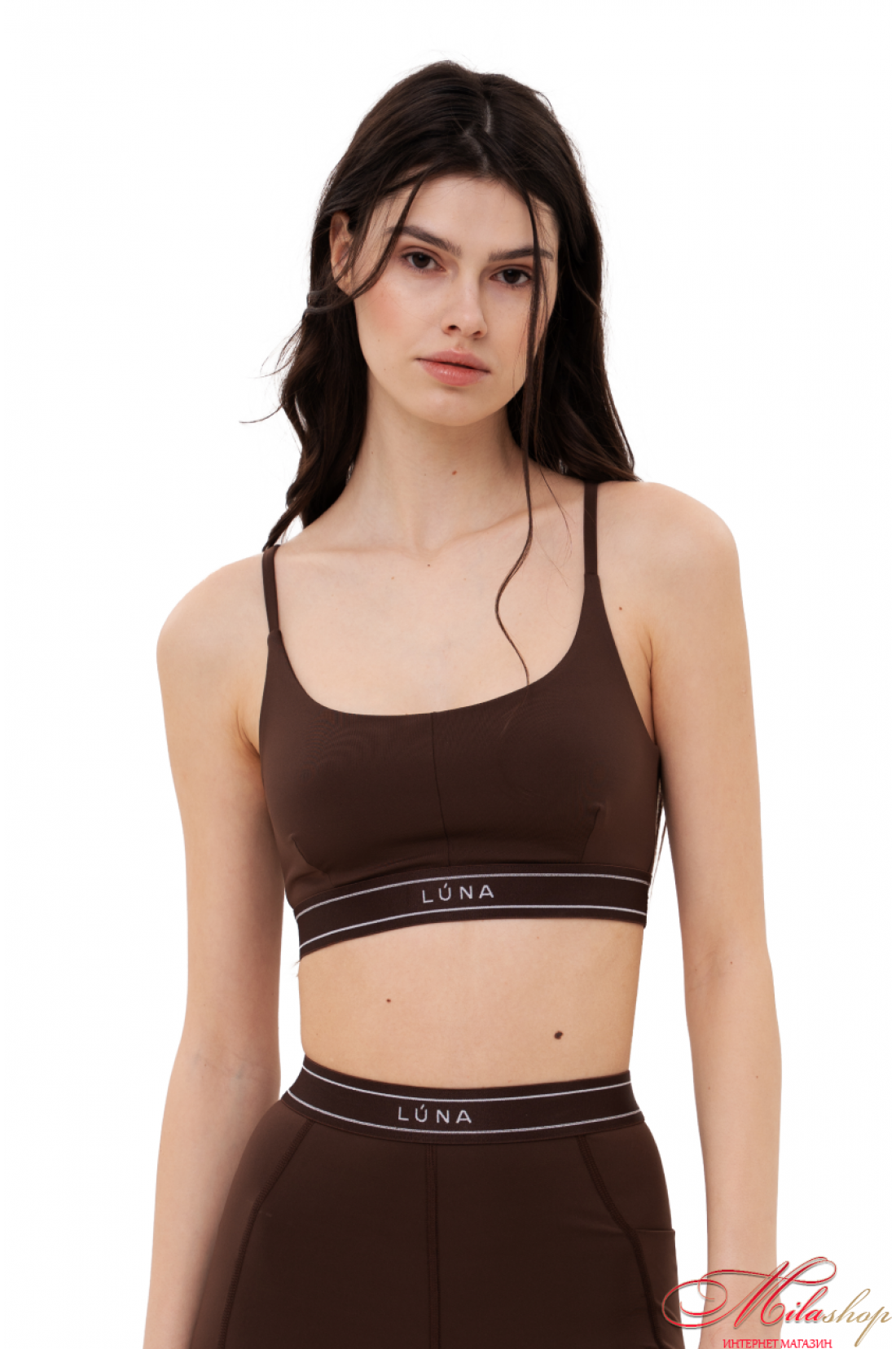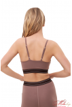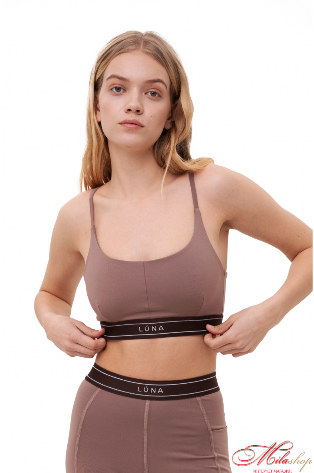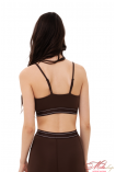 Кроп топ на брителях, довжиною до сонячного сплетіння. Має округлу поглиблену горловину. По низу - манжет- брендована резинка. Топ з підкладкою з основної тканини, тобто подвійний, за рахунок чого він щільніший. Брителі з регуляторами довжини. Тканина - біфлекс, гарно тягнеться, має гладеньку фактуру, кольорі капучино має більшу щільність, та менше тягнеться, це враховано в лекалах.