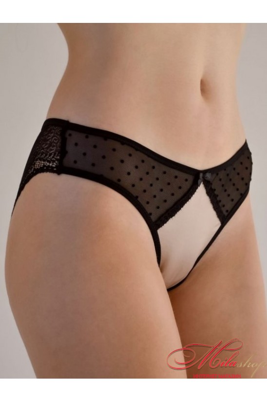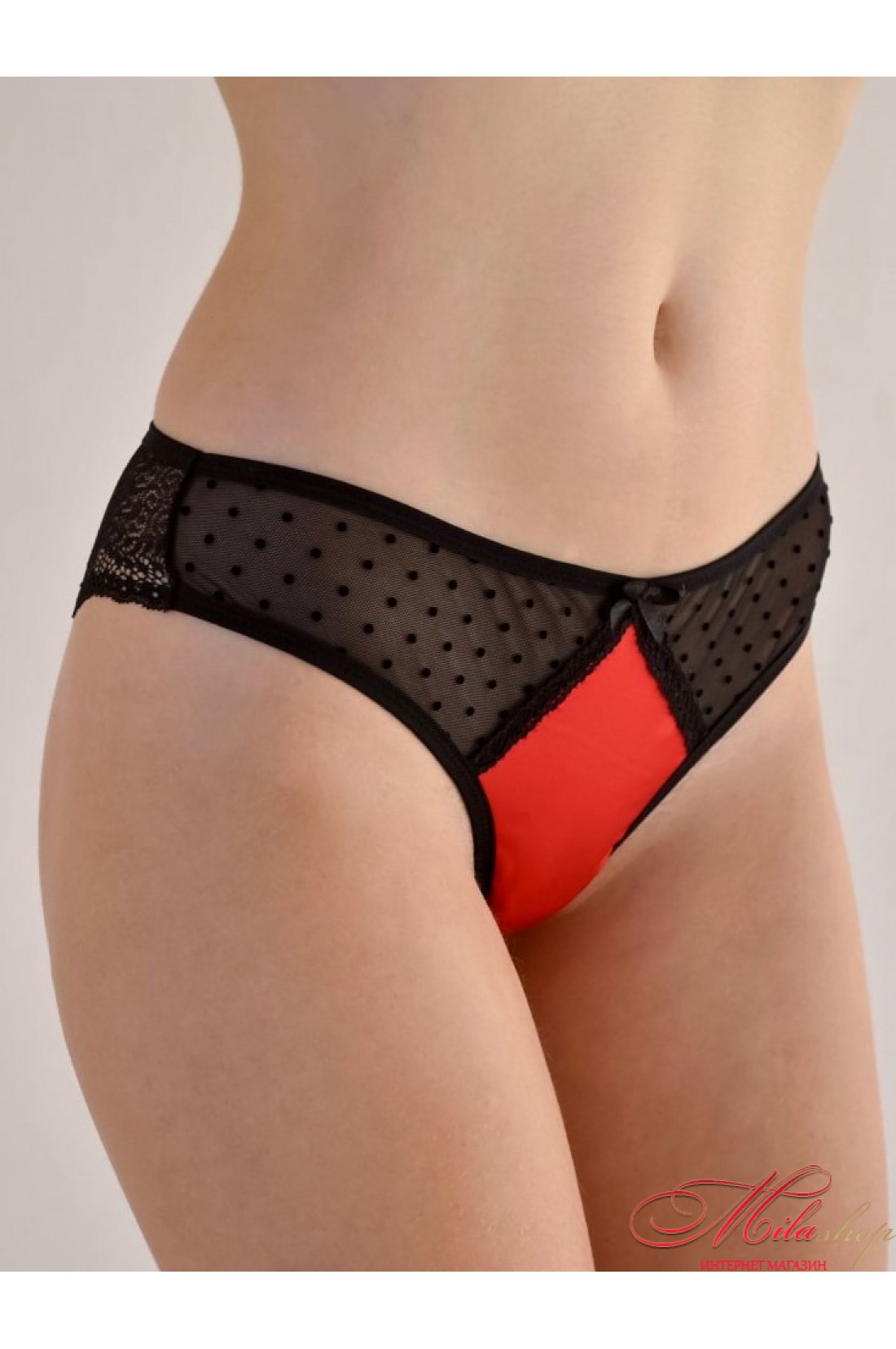 Трусики-бразилиана выполнены из сатина, кружева и микросетки. Задняя деталь с вертикальным швом, благодаря которому у трусиков идеальная посадка. Хлопковая ластовица.