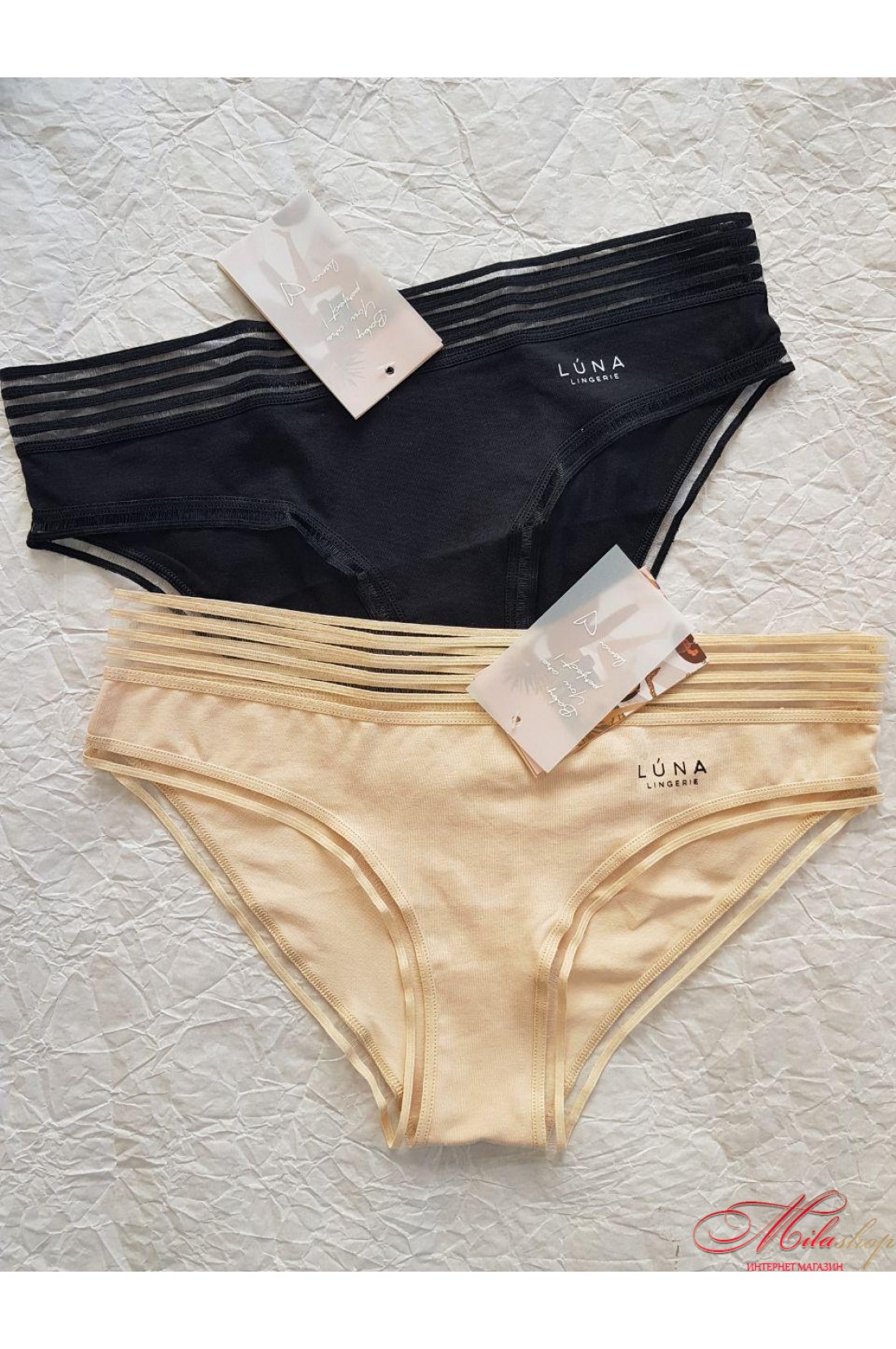 Трусики сліпи з низькою лінією талії. Виконані з бавовни. Родзинкою цих трусиків є сітчаста смуга гумка.