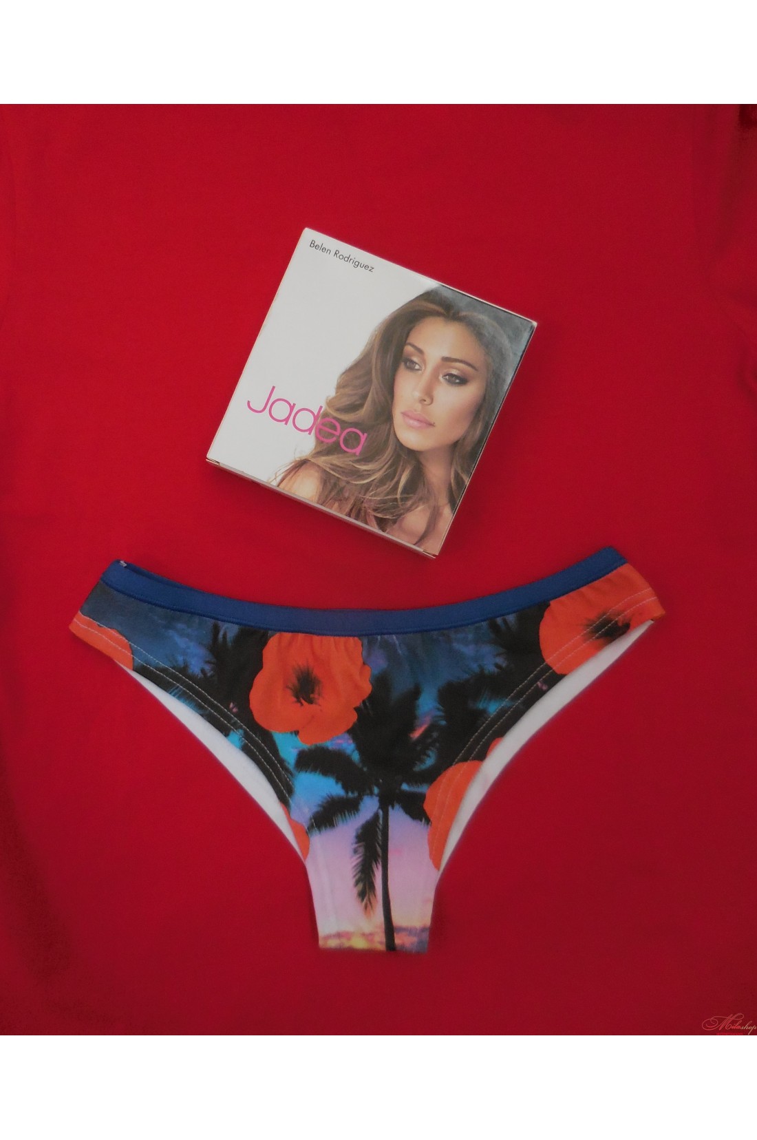 Jadea 6768 трусики-бразилиано низкая посадка, на передней части цветной принт; срезы по ножкам обработаны подгибом, на поясе резинка обшита трикотажным полотном.