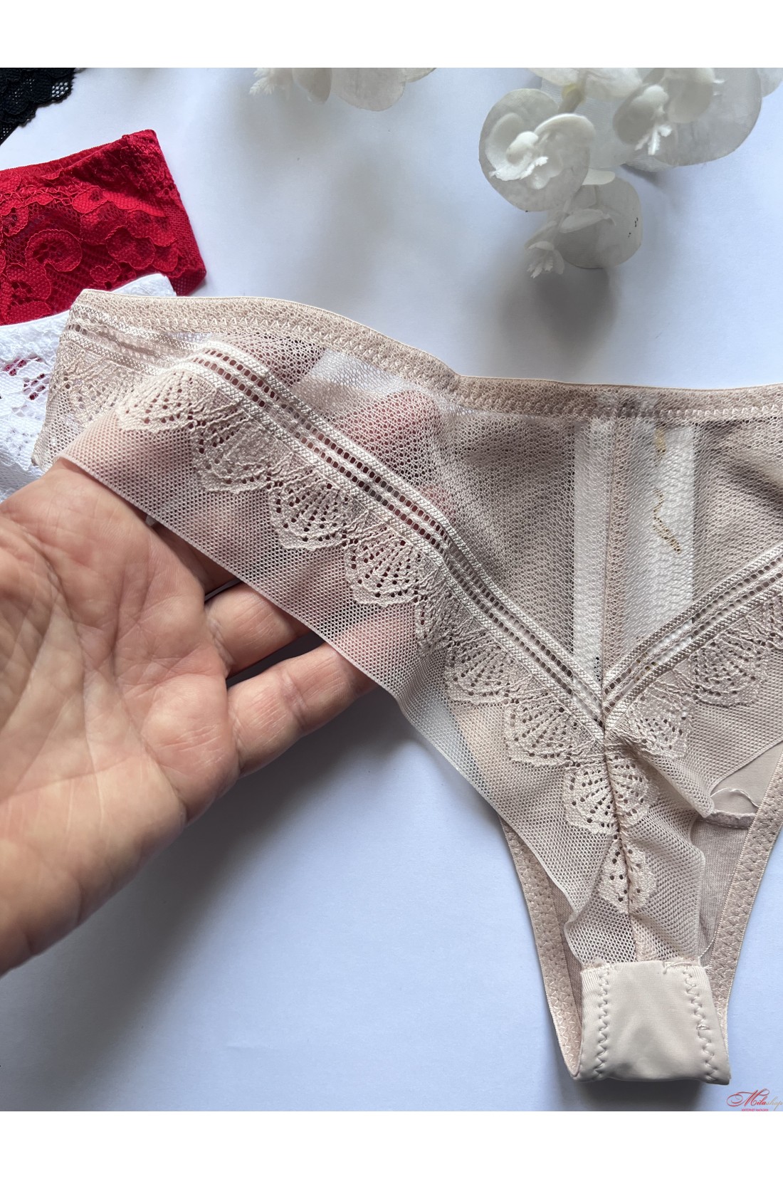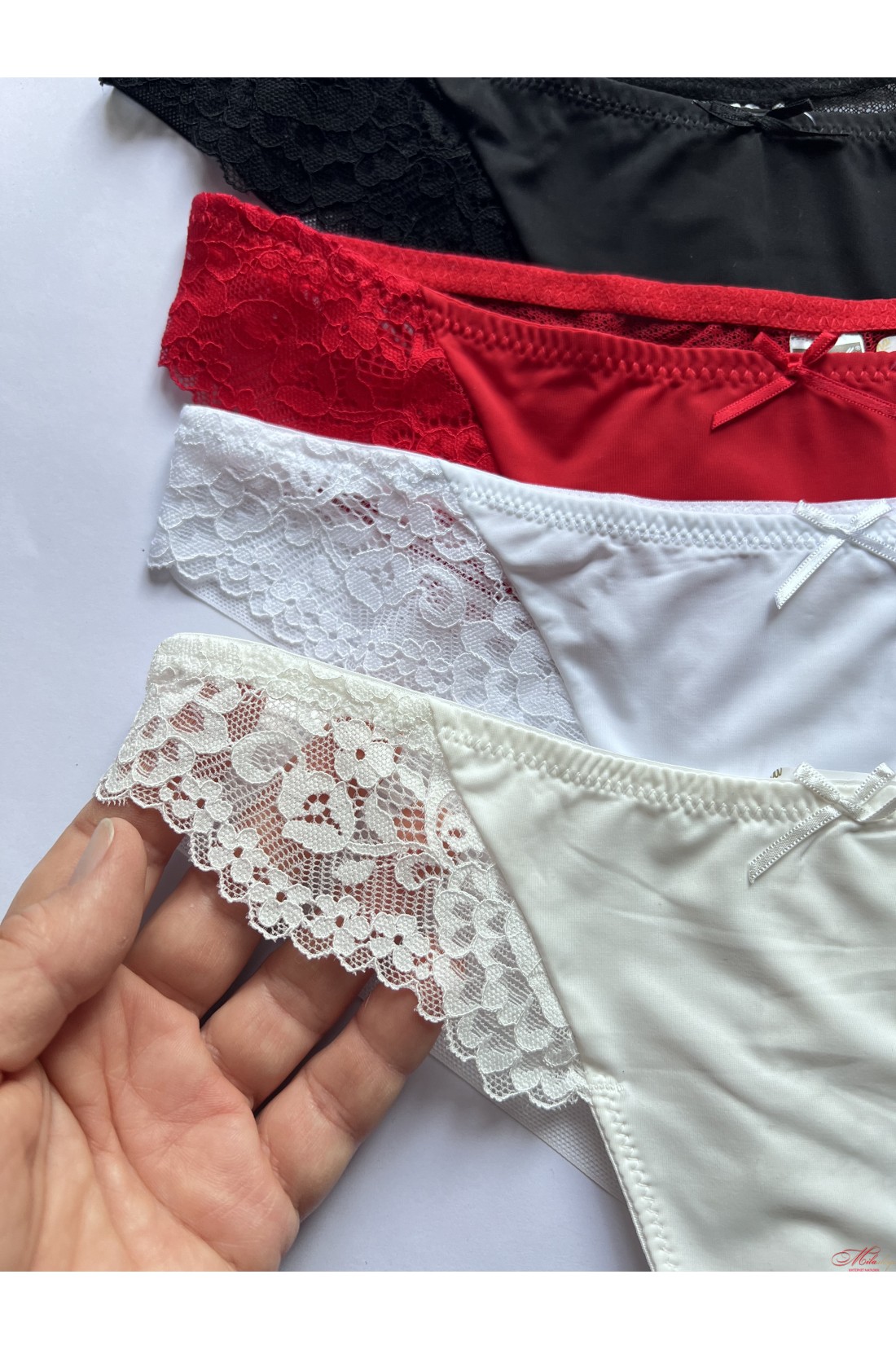 Бразиліана із середньою лінією талії. Виконані з мікрофібри та мережива. Приємні на дотик.