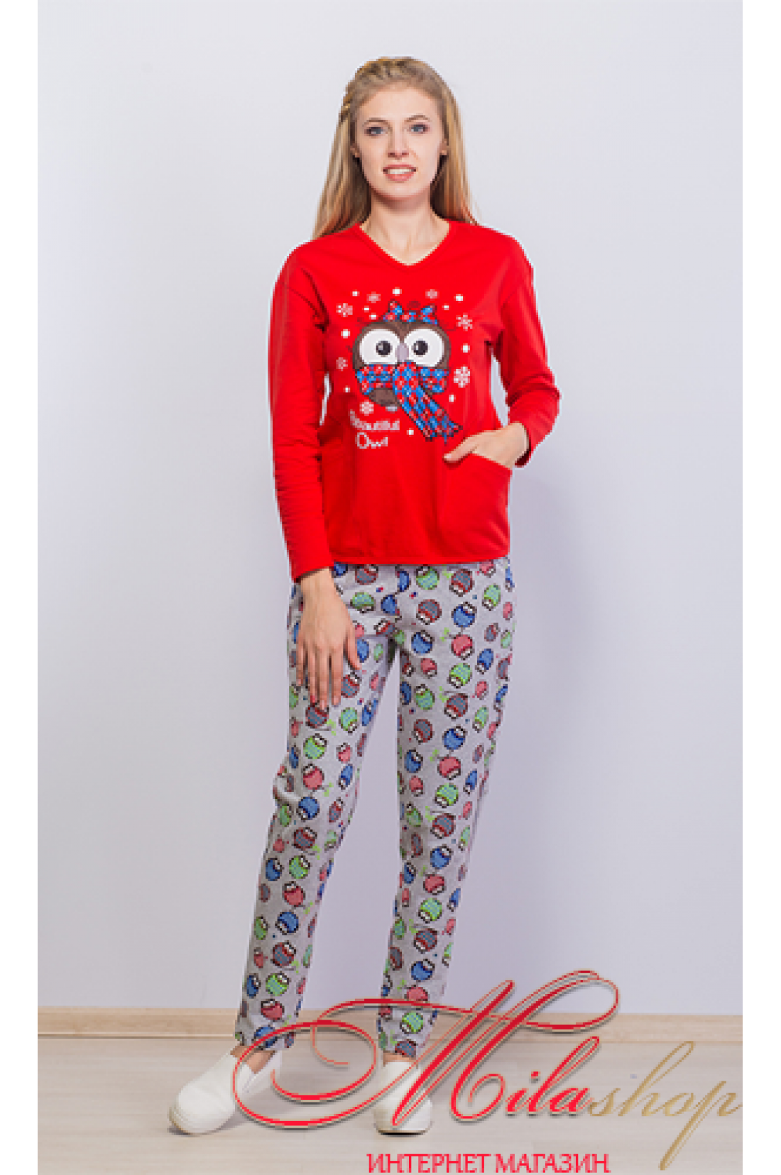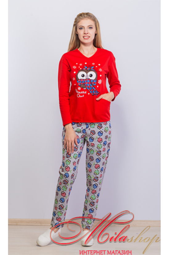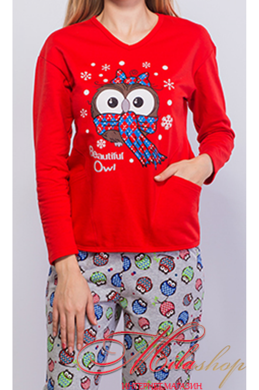 Хлопковая пижама с начесиком декор накатка в виде совы + кармашки по бокам , штанишки серого цвета декор совики