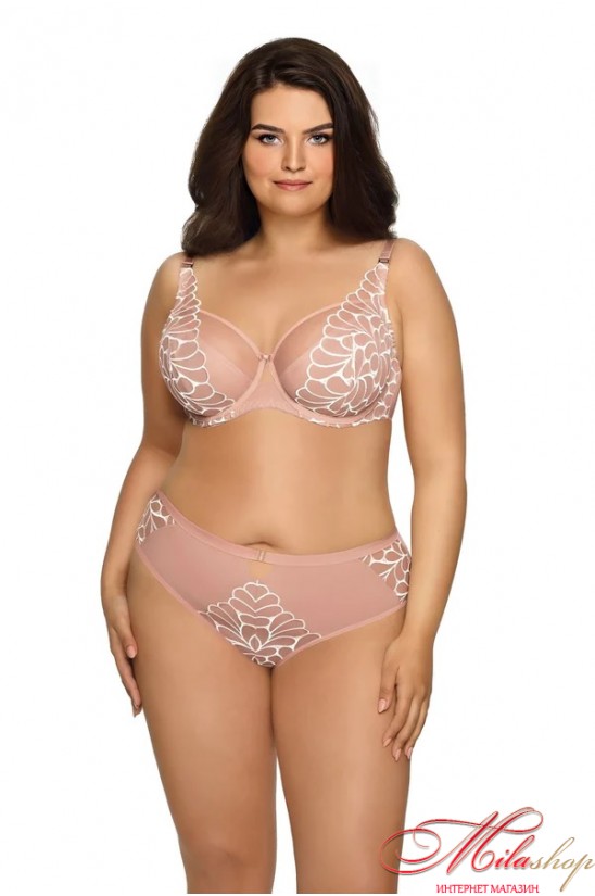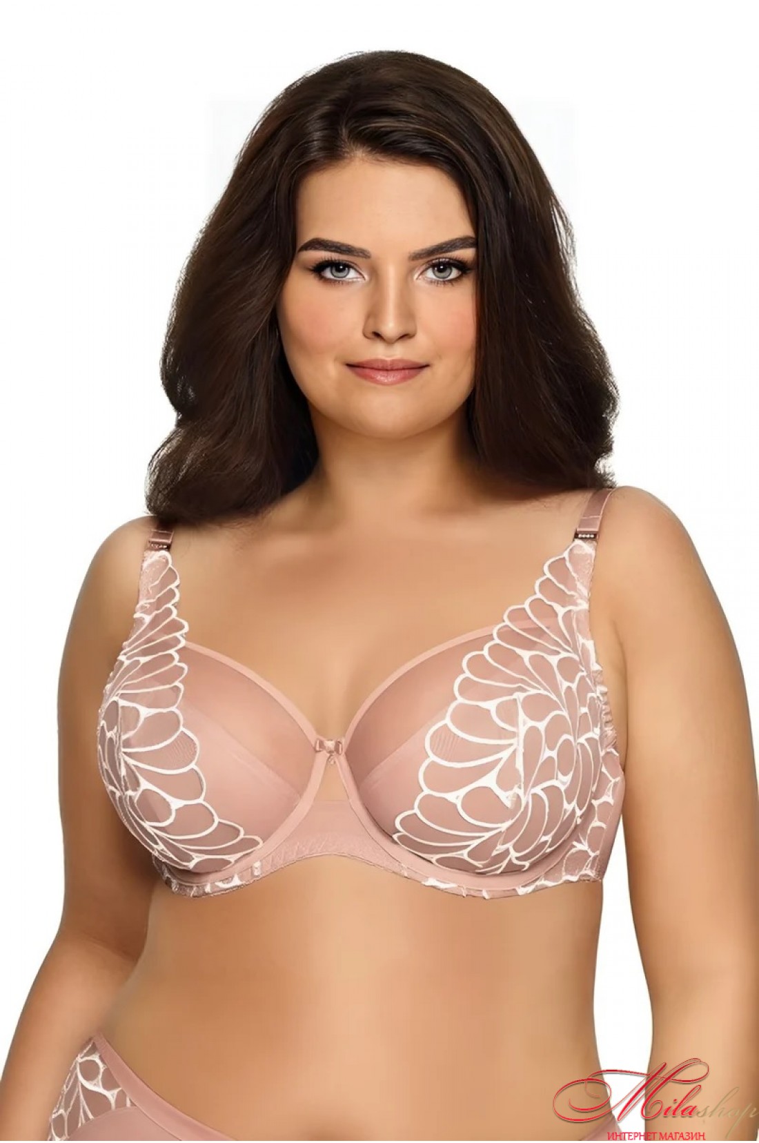 Ефектний бюстгальтер від відомого польського бренду AVA. Модель виконана з тонкої і міцної сіточки європейської якості і декорована вишивкою. М'які чашки на кісточках, складного крою, з діагональним і вертикальним швом. Конструкція чашок дозволяє підняти і зібрати до центру груди, створюючи ідеальну форму бюста. Чашечки і частина бретелей декоровані гарною вишивкою у вигляді ангельських крил. Перемичка "арочного" типу не тисне на живіт, забезпечуючи свободу рухів і комфорт. Центр перемички прикрашений мініатюрною підвіскою у вигляді бантика з кристалом. Незнімні бретелі з практичними регуляторами довжини, прикрашені декоративними елементами з кристалами. Широкий пояс забезпечує надійну підтримку для бюста протягом дня.
