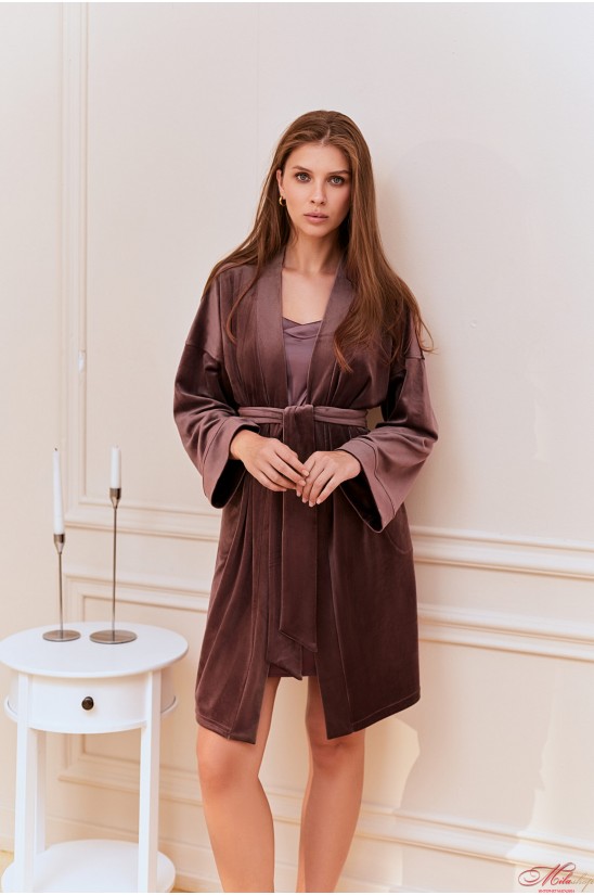 Велюровий халат з м'яким коротким ворсом з блиском, опущена лінія плеча, прямі довгі рукави, крій на запах дозволяє регулювати посадку по фігурі. Зав'язується на талії поясом.