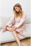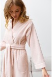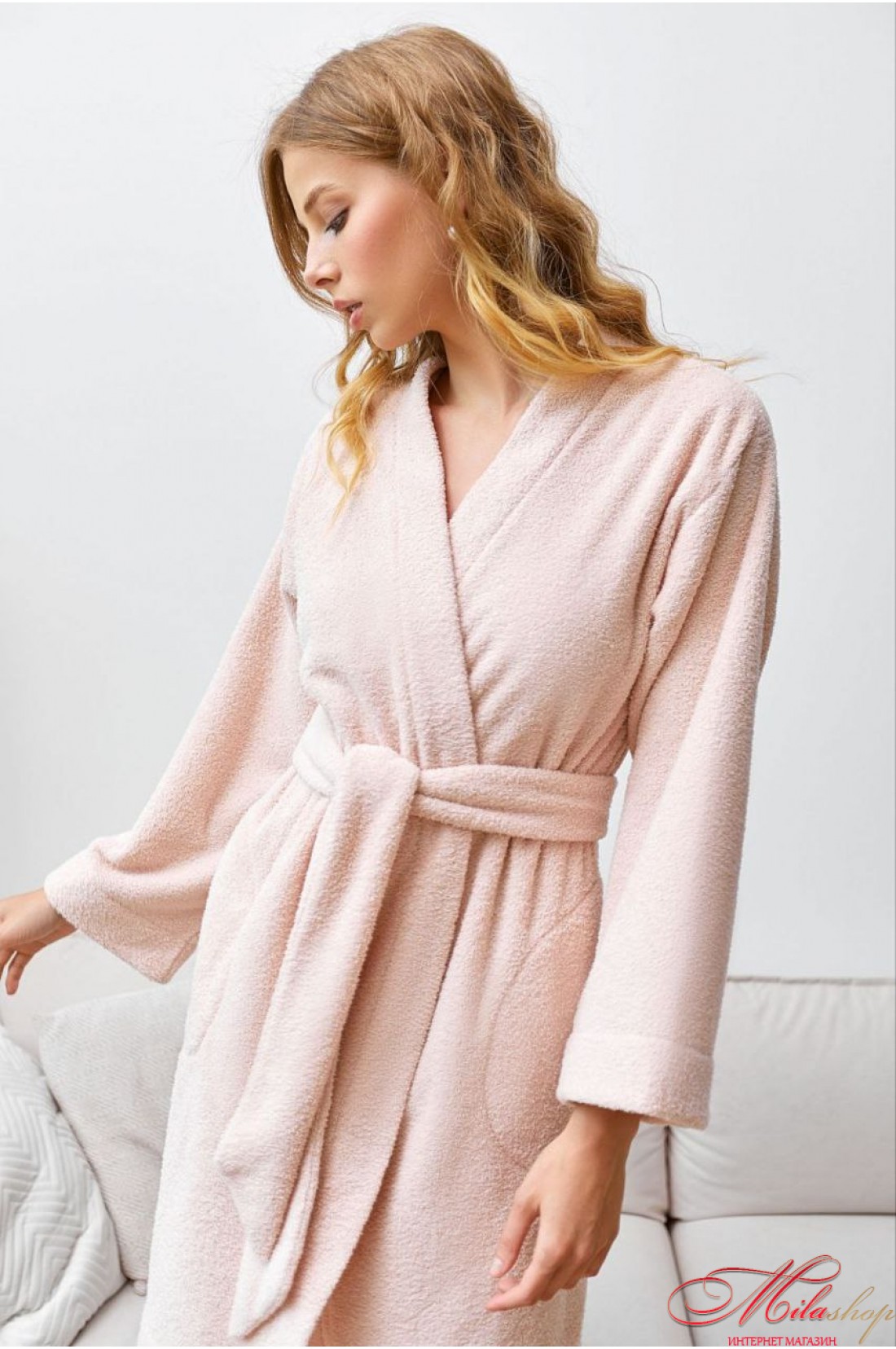 Теплий халат із полікотону-це високотехнологічна тканина нового покоління. Вона відноситься до змішаних тканин, в яких поєднані волокна поліестеру та бавовни. Зберігає тепло тіла і добре вбирає вологу. Довгі прямі рукави, крій на запах дозволяє регулювати посадку по фігурі, що зав'язується на талії поясом.