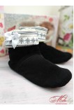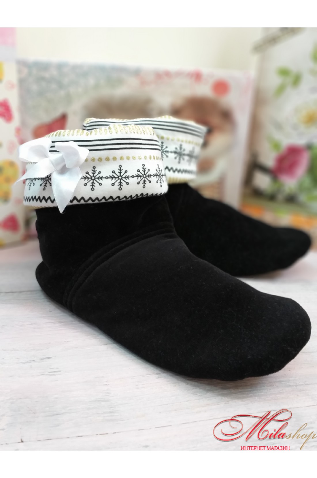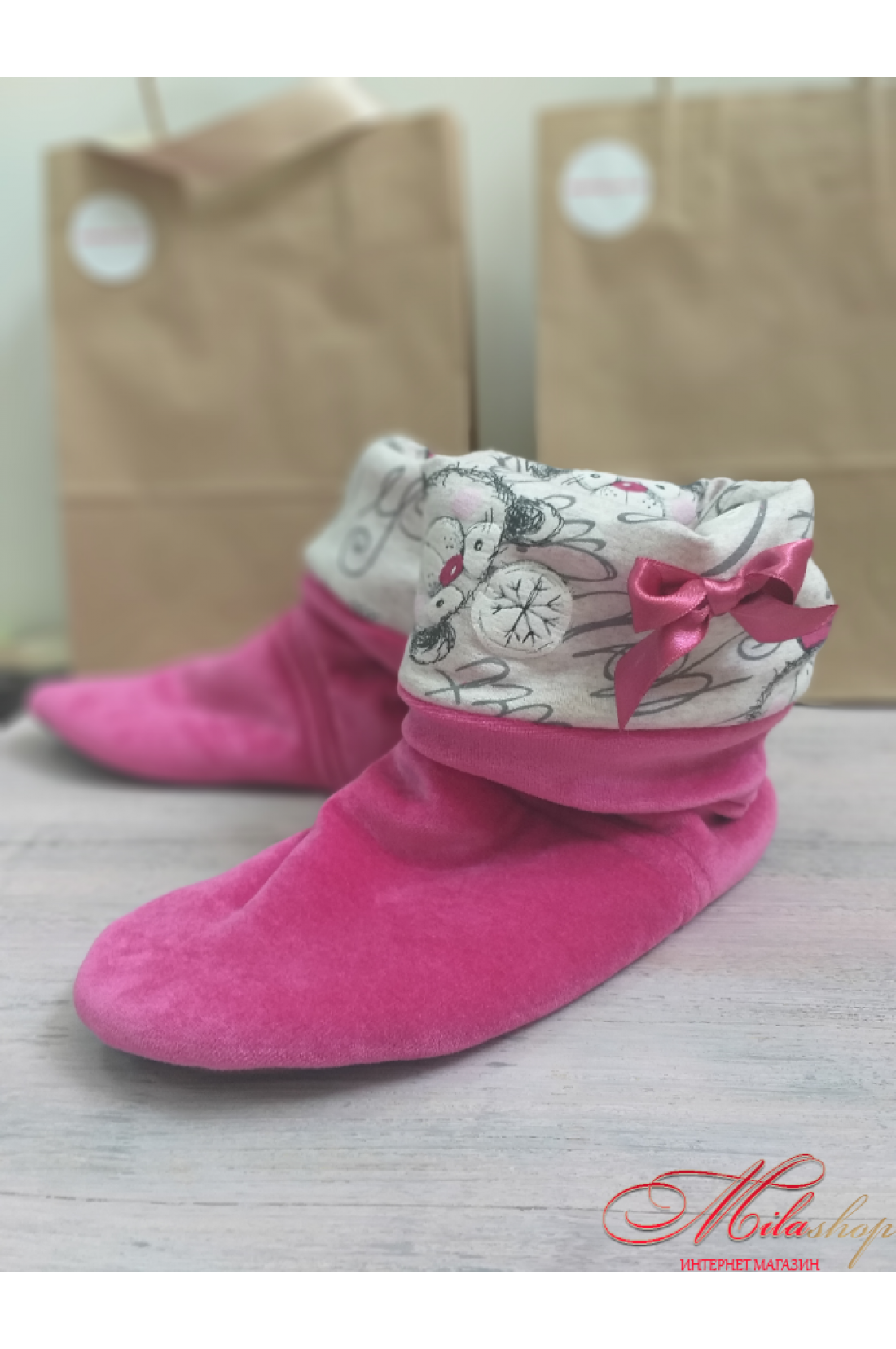 Мягкие домашние тапочки, выполнены из яркого велюра и принтованого хлопка. Мягкая подошва, декор бантики.
