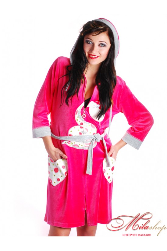 Теплый короткий, велюровый халат с капюшоном. На змейке.