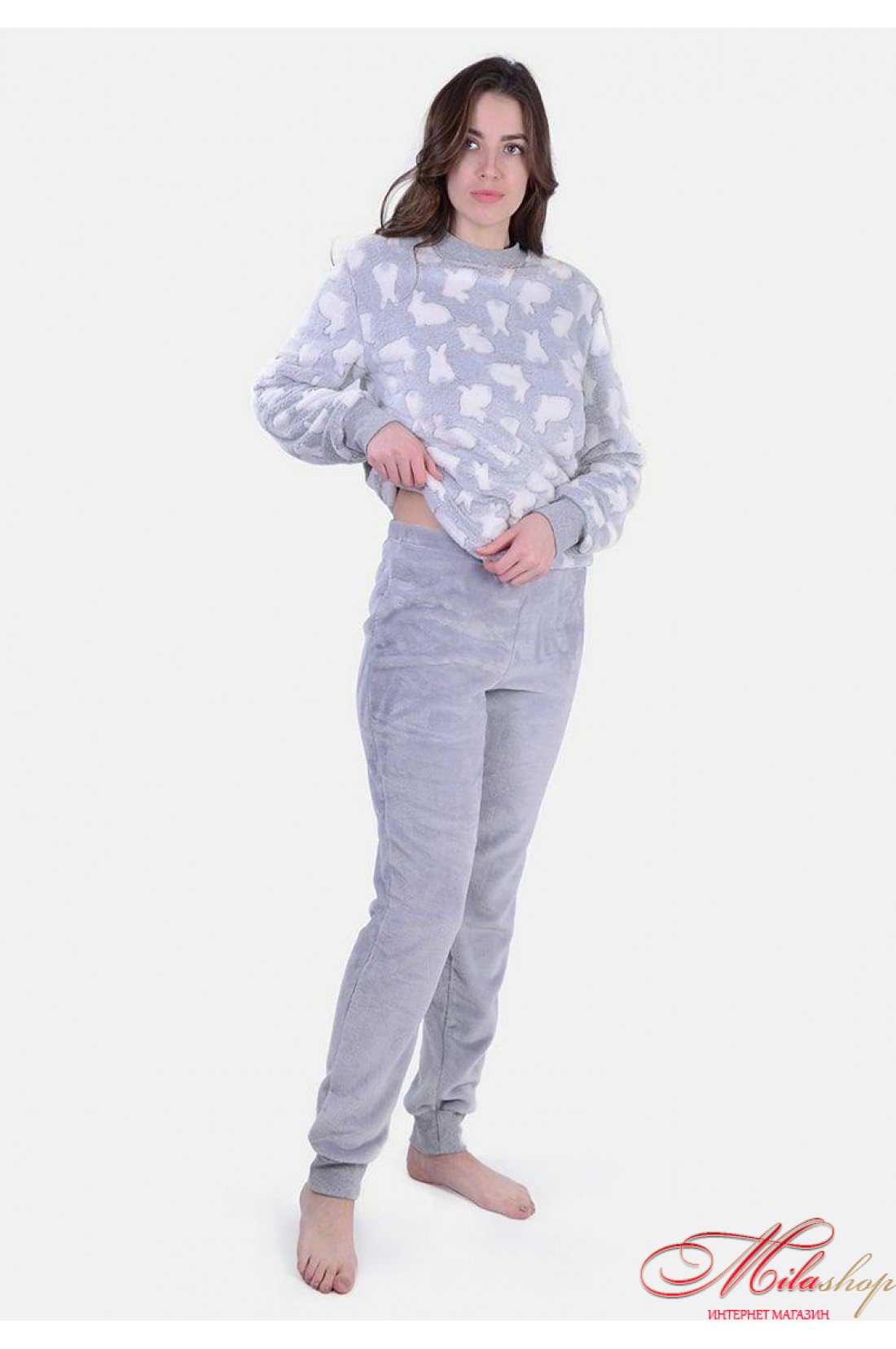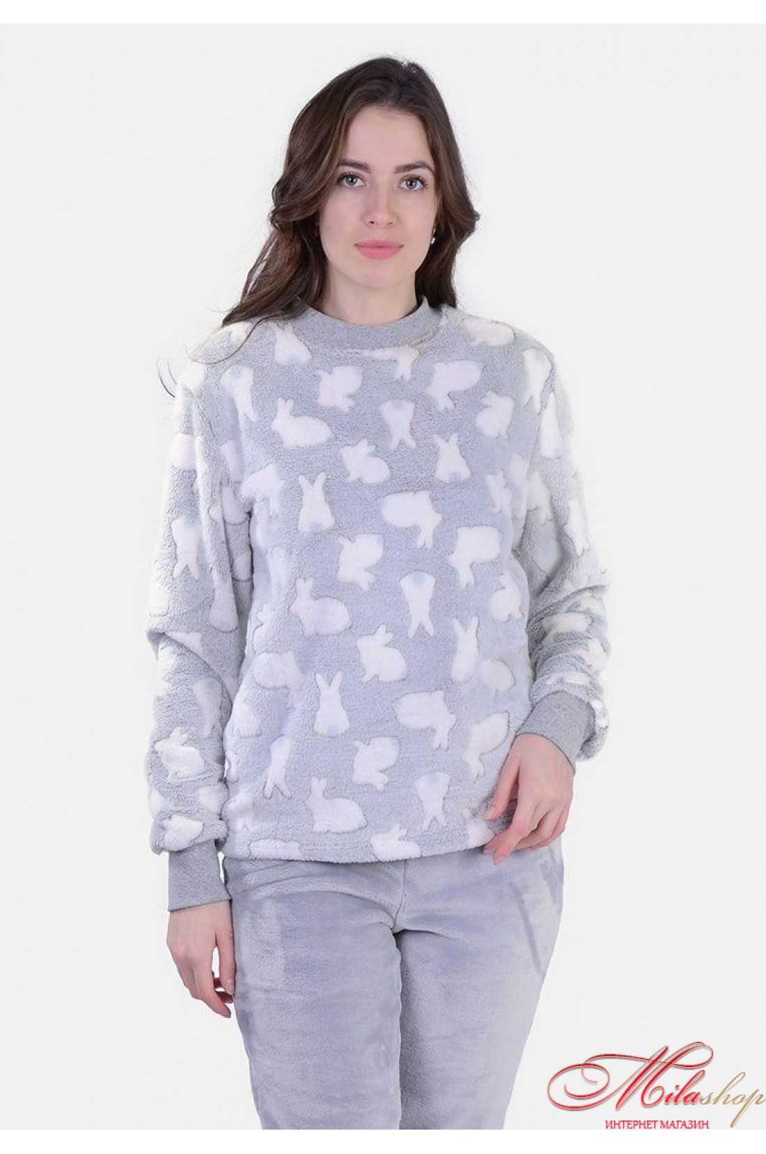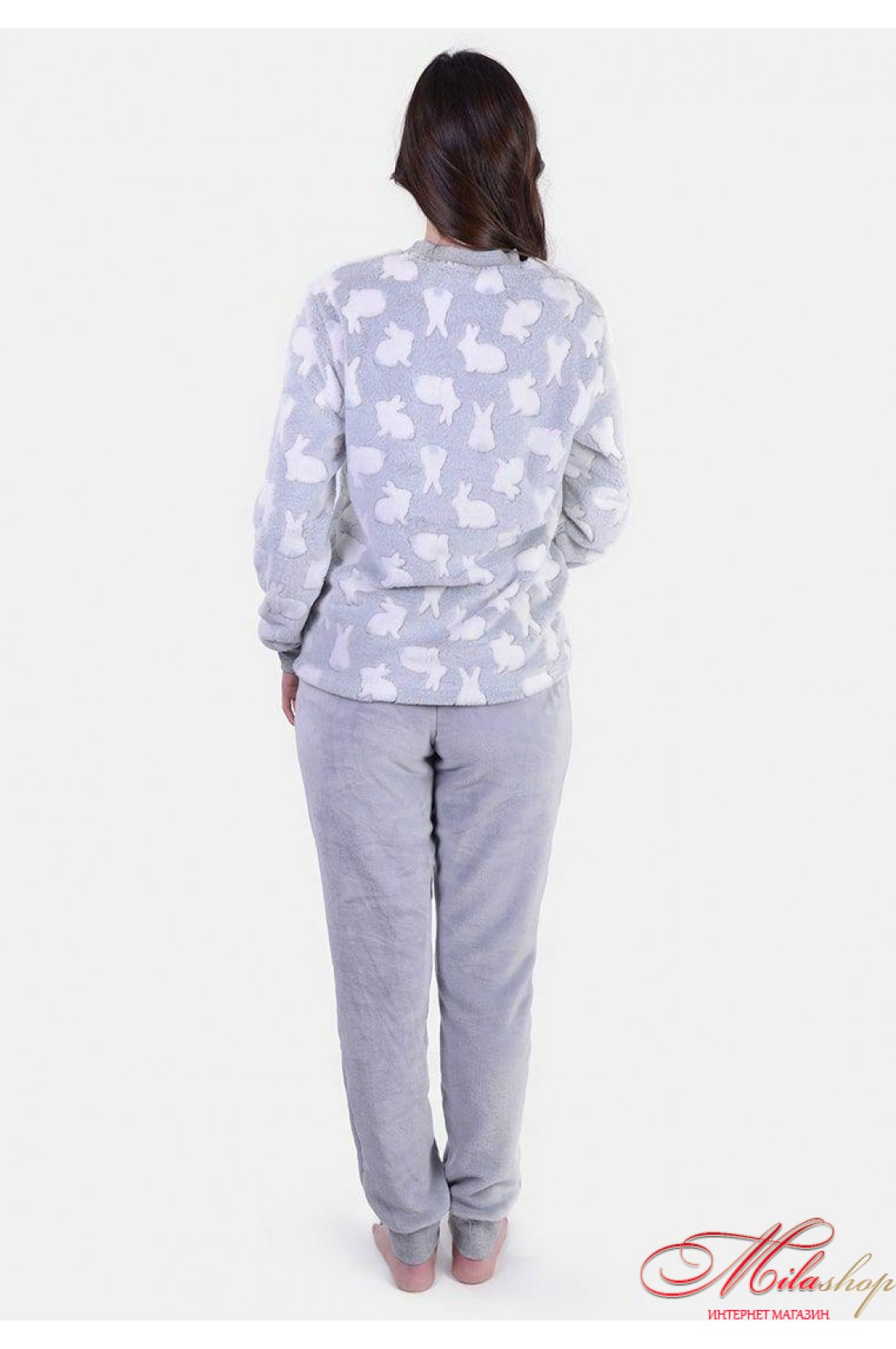 Невероятно мягкий костюм, который создан для сна отдыха. Костюм состоит из однотонных штанов и кофты с длинными рукавами с принтом зайчики.