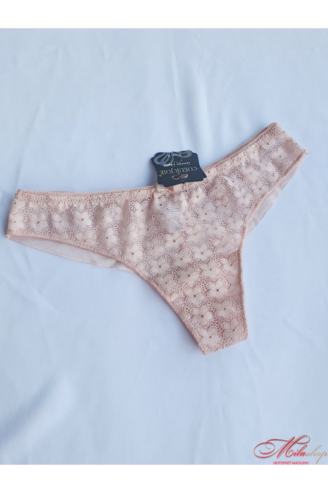 Жіночі трусики стрінги з мережива та мікрофібри. Передня деталь вся продубльована мереживом, задня мікрофібра, тільки з обох боків обрамлена мереживом. Бавовняна ластівка.