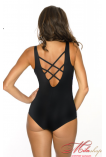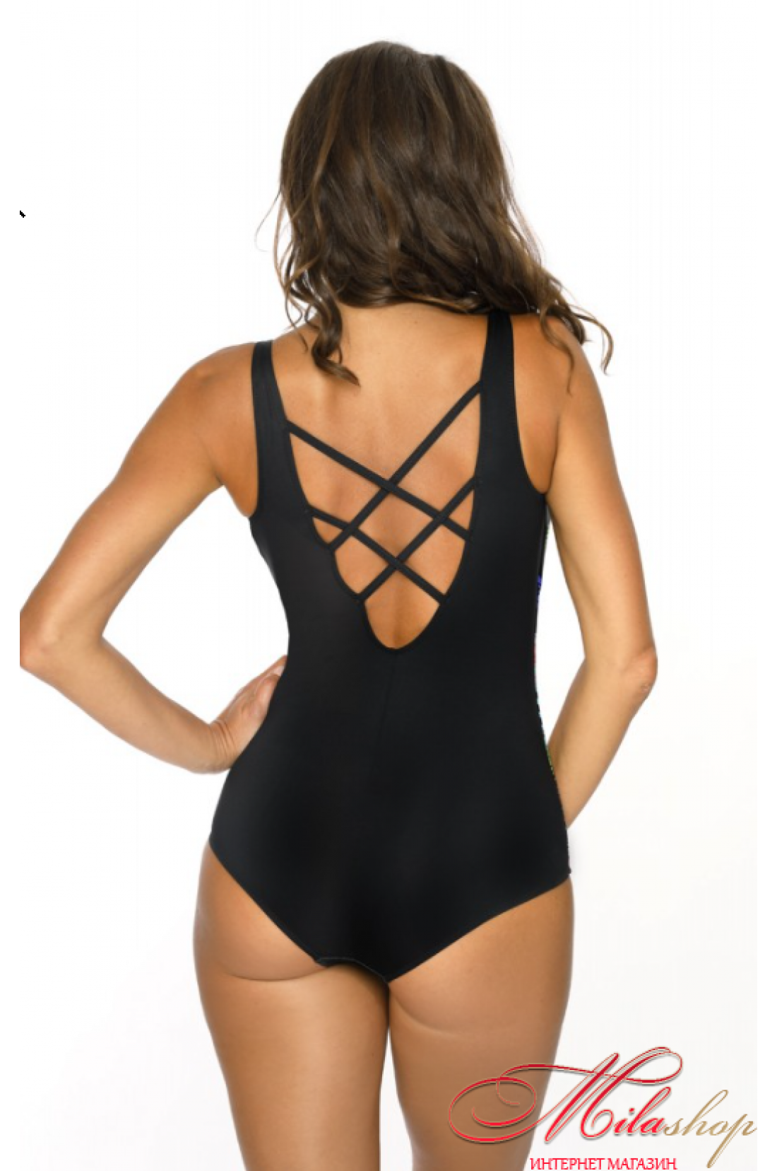 Яркий, цельносшитый купальник. Внутри вшиты чашки и резинка под грудью. Сзади спинка украшена декоративными полосками крест-накрест.