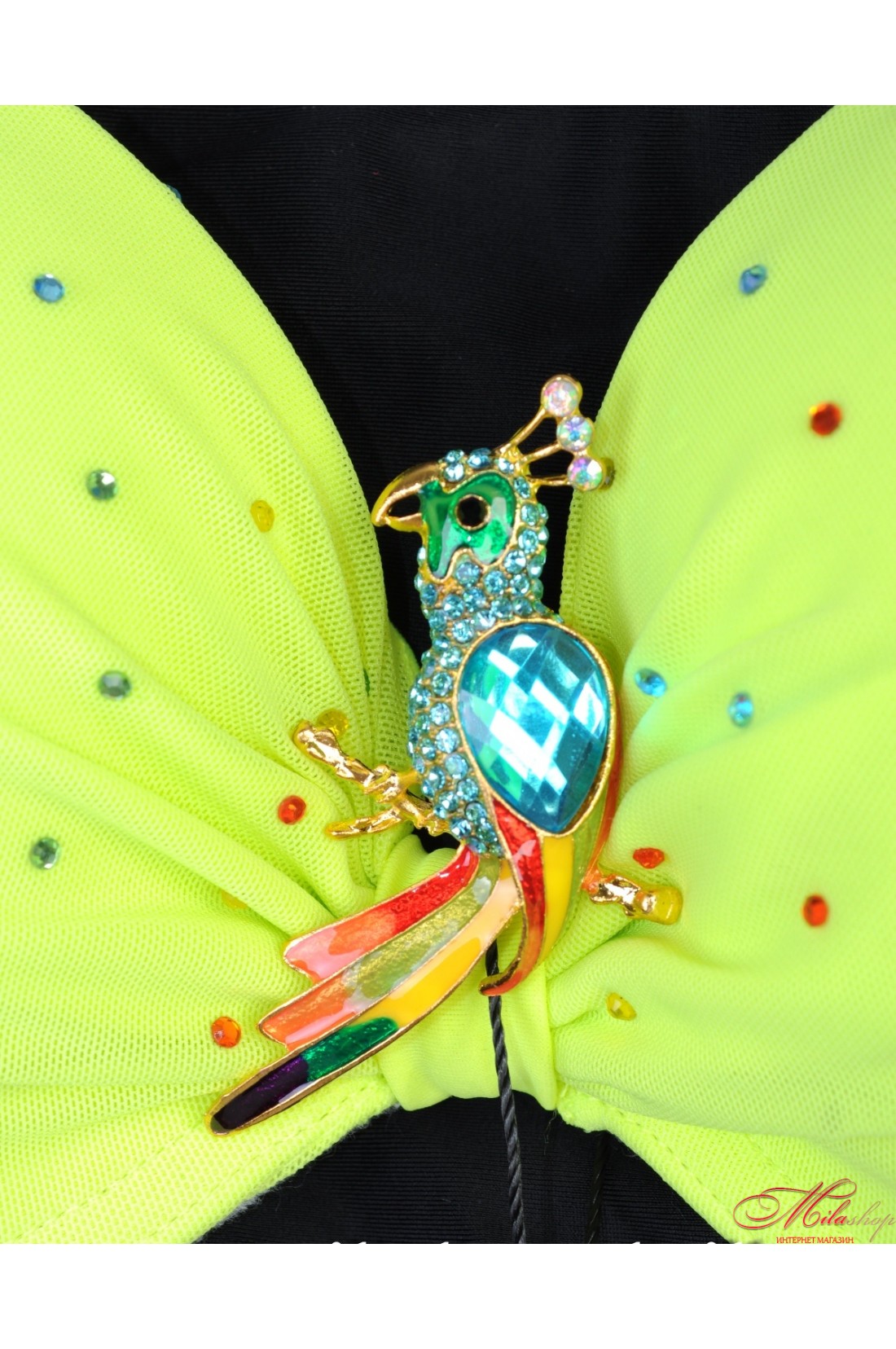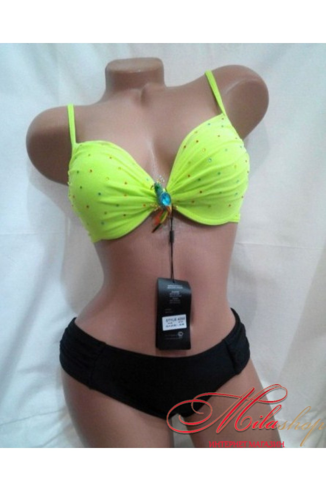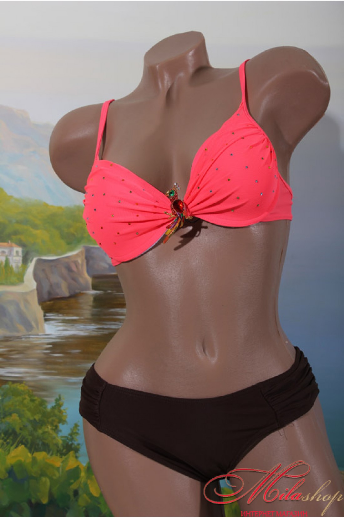 Яркий купальник из высококачественного купального полотна. Бюстгальтер с эффектом пуш-ап, украшен брошью. Трусики со средней линией талии.