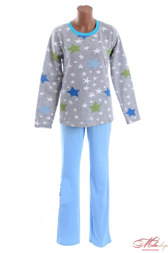 Комплект для сна состоит из футболки с длинным рукавом и штанов. Утепленный флисом. Выполнен из высококачественного хлопкового полотна. Кофта украшена рисунком "звезды", штаны однотонные.