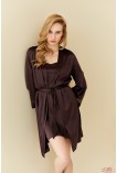 - Легкий халат из нежного атласа с глянцевым блеском. Атласное полотно приятное к телу, хорошо пропускает воздух, создает эффект прохлады на теле. Крой на запах позволяет регулировать посадку по фигуре, прямые рукава скружевом внизу. Завязывается на талии поясом.